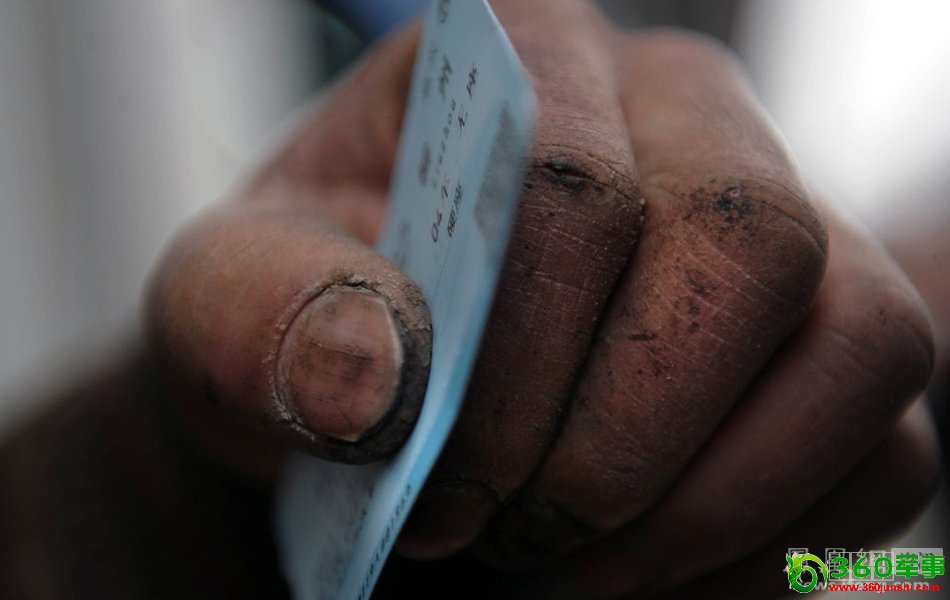 2011年1月18日,浙江嘉兴,一位民工用冻裂的手指夹着刚买到的车票,展示给仍在排队的老乡看。