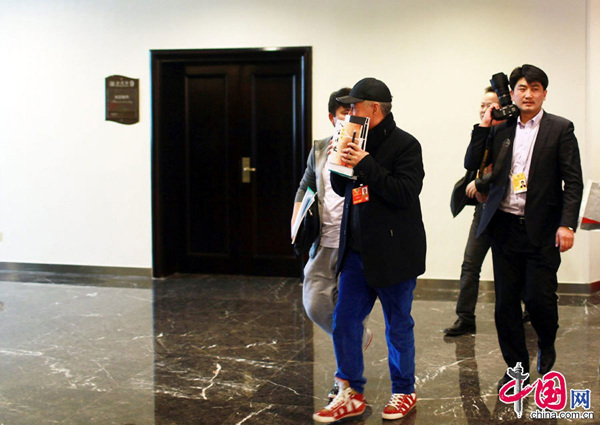 3月4日,政协文艺组小组讨论会间,赵本山用书遮脸快步走出会场。